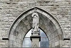 Ein ca. 50 m hoher Glockenturm mit gezimmertem und mit Schiefer verkleidetem Spitzhelm überragt das Bauwerk. Das Innere ist dreischiffig, basilikal und besitzt ein Querhaus; die Pfeiler sind betonsichtig. Im Mittelschiff finden sich Schwibbögen, auf denen eine Flachdecke ruht; in den Seitenschiffen finden sich Strebebögen. Die Fenster sind im Scheitel angespitzt, auf Maßwerk wurde jedoch verzichtet.