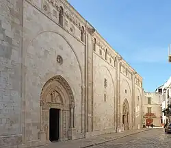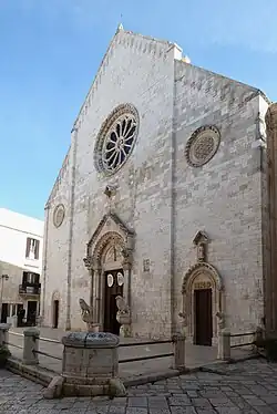 Die ostete Kathedrale der apulischen Romanik hat ihren Eingang zum Corte Altavilla, dem antiken Sitz der Grafen von Conversano, abseits des Hauptplatzes. Die Giebelfassade ist mit Pilastern dreiteilig gegliedert, im oberen Teil besitzt sie ein zwölfstrahliges Rosettenfenster aus dem 15. Jahrhundert mit doppeltem Rahmen, mit zwei kleinere Oculi an dessen Seiten. Das zentrale der drei Portale ist reich mit Skulpturen verziert und hat zwei Löwenfiguren, die mit dem Tympanon ein Propylon bilden. Der Bau des Glockenturms wurde zwischenzeitlich auf halber Höhe durch die Äbtissinnen des nahen Klosters St. Benedikt blockiert. Die Uhr wurde später hinzugefügt.