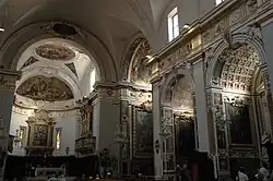 Die einschiffige Kathedrale hat den Grundriss eines lateinischen Kreuzes. Sie ist mit einem Tonnengewölbe mit Stichkappen überdacht, die von rechteckigen Fenstern beleuchtet werden. Über dem Chor erhebt sich eine Hängekuppel. Seitlich schließen sich an das Langhaus jeweils fünf rechteckige Kapellen aus dem 17. Jahrhundert mit Altären an, die Tonnengewölbe sind mit Kassetten bedeckt. In den beiden Armen des Querschiffs befinden sich zwei weitere Kapellen, rechts die für Johannes den Täufer, links eine Allerheiligenkapelle, beide mit Fresken von Giuseppe Bastiani ausgestaltet. Der erhöhte Chor besitzt einen Hochaltar mit Antependium, hinter ihm befindet sich ein altes Kruzifix. Entlang des Umfangs der Apsis befinden sich das hölzerne Chorgestühl und rechts der Bischofsstuhl.[2] Das Chorgestühl bietet Zugang zur Kapelle San Lorenzo mit Fresken von Allegretto Nuzi, vermutlich aus dem Jahr 1365.[3]