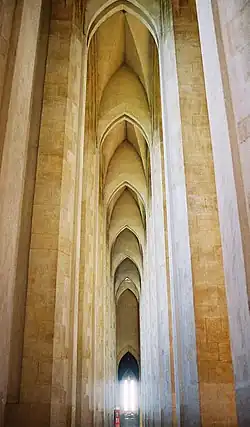 Der Kirchenbau ist dreischiffig, wobei die Seitenschiffe äußerst schmal gehalten sind und eigentlich nur als schmuckloser Zugang zum Kirchengestühl genutzt werden können. Sie sind mit dem ebenfalls kreuzgratgewölbten und nur wenig erhöhten Mittelschiff durch hohe oktogonale Stützen ohne Basis und Kapitell verbunden. Der von außen so markante ca. 50 m hohe Vierungsturm wird im Innern der Kirche nur in geringem Maße wirksam; im Turm befinden sich 12 Glocken.