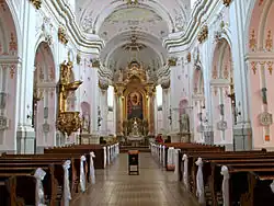 Die Ausstattung der Kirche zog sich bis 1770 hin, musste aber nach einem Feuer bereits 1816 restauriert werden. Die Stuckarbeiten an der Decke stammen von italienischen Meistern, das Hochaltarbild, das die Himmelfahrt Marias zeigt, wurde von Leopold Kupelwieser aus Wien gefertigt. Die Figuren vor dem Hochaltar stellen die Könige Stephan I. und Ladislaus I. dar.