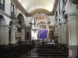 Die dreischiffige Kirche mit schmalen Seitenschiffen wurde im Stil des Manierismus errichtet. Die nüchterne Doppelturmfassade fasst einen Dreiecksgiebel zwischen den beiden Glockentürmen ein. Das mit quadratischen Säulenreihen zu den Seitenschiffen abgegrenzte Hauptschiff ist mit einem Tonnengewölbe mit dem Deckengemälde überdacht. An das Langhaus schließt sich der durch einen Bogen abgeteilte, niedrigere Altarraum mit dem gemalten Hochaltar an. Seitlich neben dem Altarraum und an den Enden beider Querschiffe wurden weitere Altäre aufgestellt, deren Stile vom Barock bis in den Rokoko reichen.