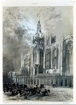 Während der Revolution war der Metzer Dom in den Jahren 1791 bis 1793 heftigsten Zerstörungsorgien der revolutionären Religionsfeinde ausgesetzt, die nahezu alle Altäre und historischen Grabstätten demolierten. Nur aus Kostengründen waren damals die Heiligendarstellungen der Fenster des Domes der Zerstörungswut der Jakobiner entgangen. Erst mit dem Konkordat von 1801 konnte im Folgejahr 1802 die Metzer Kathedrale wieder dem christlichen Kultus übereignet werden.[8][9]