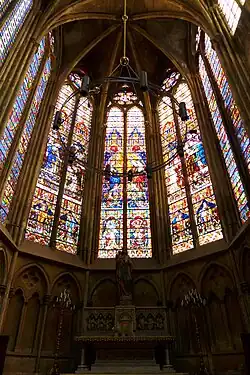 Im 20. Jahrhundert wurden einige Glasfenster nach den Entwürfen von Marc Chagall eingebaut sowie die Sakramentskapelle mit starkfarbigen Fenstern von Jacques Villon ausgestattet. Die früheren Fenster der Sakramentskapelle waren bei Kämpfen zur Befreiung von Metz im Jahr 1944 stark in Mitleidenschaft gezogen worden.[17][18] Nach einem starken Sturm überzog man 1952 die gesamten Dachflächen (2000 m²) neu mit Blei. Als Krönung setzte man 1959 den vergoldeten Engel mit einer Trompete auf den Dachfirst des Chores.[19]