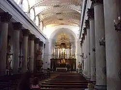 Die klassizistisch anmutende Fassade der Kirche wird geprägt von einem giebelbekrönten Portikus mit zwei seitlichen Turmaufsätzen; der Dreiecksgiebel des Portikus ist nochmals von einem Rundgiebel überfangen, der die Dachform widerspiegelt. Das im Aufriss basilikal angelegte Langhaus der Kirche ist dreischiffig und mit einem eher flachen Kreuzrippengewölbe, in welches Stichkappen eingefügt sind, bedeckt; ein Querschiff bzw. eine Vierungskuppel fehlen. Die langen Architrave des Langhauses werden von Säulenreihen getragen.