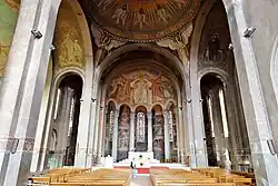 Decken und Wände der Kirche sind mit Fresken versehen; das Apsiskalotte zeigt den thronenden Christus, der auf sein Herz weist (Heiligstes Herz Jesu). Die Fenster sind beinahe mosaikartig angelegt.