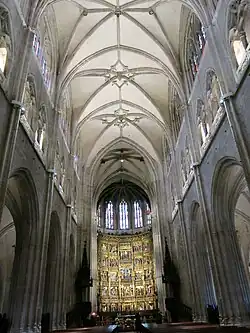 - Der Hauptaltar ist dem Erlöser geweiht. Das Retabel wurde im Jahr 1511 von Giralte de Bruselas begonnen und 1531 von Juan de Balmaseda und Miguel Bingeles vollendet. Es ist mit 12 × 12 m „selbst für spanische Verhältnisse riesig“.[15] 24 Szenen aus dem Leben Jesu sind darauf dargestellt.[16]