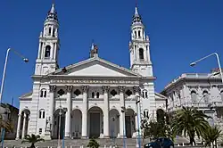 Der Vierungsturm ist mit etwa 35 m der höchste Bauteil der Kirche; er besteht aus einem durchfensterten Tambour mit Kuppel und einer Laterne. Die Fassade beeindruckt mit zwei ca. 30 m hohen Glockentürmen (campanarios), zwischen die ein fünfbogiger Portikus mit Dreiecksgiebel eingespannt ist. Das Langhaus ist dreischiffig; das Mittelschiff mit seinen Doppelsäulen ist von einem Stichkappengewölbe bedeckt, wohingegen die Seitenschiffe Flachdecken mit Oberlichtern haben.