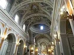 Das Innere der Kirche ist einschiffig auf einem kreuzförmigen Grundriss, wobei die Querschiffe etwas unsymmetrisch dimensioniert sind. Die Kathedrale ist 50 Meter lang und 7,5 Meter breit. Der rechte und linke Arm des Querschiffs sind 13,50 bzw. 19,70 m lang. Das Langhaus ist durch Querbögen auf Strebepfeilern in vier Joche gegliedert. Daran schließt sich die Vierungskuppel auf einem von vier Fenstern beleuchteten, achteckigen Tambour an. Nach dem Querhaus folgt der zweijochige, etwas eingezogene Chor, der mit einer runden Apsis schließt. Die Decken sind von der Kuppel auf den Pendentifs ausgehend als Tonnengewölbe ausgeführt, beleuchtet durch eingeschnittene Lünetten.[3]