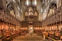 Am Chorgestühl mit seinen 34 Miserikordien finden sich Datierungen zwischen 1489 und 1494. Hergestellt wurden sie von Schnitzmeister William Bromflet und seinen Schülern. Jeder dieser Sitzblöcke, die älteren Angehörigen des Klerus erlaubten, sich während der oft mehreren täglichen Gottesdienste ein wenig auszuruhen, ist aus einem Eichenblock geschnitzt und köstlich verziert. Darunter sind biblische Motive wie Josua und Kaleb, die die Weintraube aus dem Gelobten Land tragen,[10] Samson, der aus der Stadt Gaza ausbricht und dabei das halbe Stadttor mitnimmt,[11] oder zwei Szenen des Propheten Jona, der einmal von den Seeleuten über Bord ins Meer geworfen wird[12] und in der zweiten Szene vom Wal wieder an Land gespuckt wird.[13] Es sind aber auch vielerlei Tiere abgebildet wie Löwen, ein Greif, der ein Kaninchen jagt, Jagdhunde, die einen Fuchs fassen, oder ein Pelikan, der seine Jungen füttert. Besonders witzig ist eine Szene von zwei Ferkeln, die einem Schwein zusehen, das einen Dudelsack spielt. Vielleicht ein Spott gegenüber den Schotten, die im frühen 15. Jahrhundert Ripon geplündert hatten.[14]