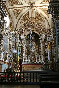 Die Kirche zeichnet sich durch eine prächtige Innenausstattung aus, die vom Barocco Joanino bis zum Rokoko reichen. Der Hauptaltar mit gewundenen Säulen ist mit reichverzierten Engelsfiguren versehen. Unter der Taube als Symbol des Heiligen Geistes steht die Statue der Schutzpatronin, eine großartige Darstellung der Jungfrau der Säule auf Wolken und Engeln. Sie wird von ausdrucksstarken Statuen und goldener Pracht eingerahmt. Sechs Seitenaltäre säumen das Kirchenschiff, vier an den Seiten und zwei neben dem Triumphbogen. Die Altäre sind mit raffinierten und dicht vergoldeten Holzschnitzereien, besonders floralen Motiven, auszeichnen, sowie einer Fülle von Engelsfiguren, die sich mit Arabesken und Girlanden, Kolonnetten und Voluten vermischen. Die Altäre folgen dem gleichen Grundmuster, weisen jedoch Unterschiede auf.[3]