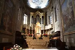 Auf der Innenseite des Eingangs zeigt ein Fresko von Coghetti Jesus, der die Händler aus dem Tempel vertreibt, Coghett schuf auch die Fresken des Gewölbes, des Chors und der Kuppel. Vom Haupteingang befinden sich rechts ein Marmorkruzifix aus dem 15. Jahrhundert und links ein Taufbecken, die beide aus einer byzantinischen Hauptstadt aus dem 6. Jahrhundert stammen und in der alten Kathedrale von Savona standen. Vor dem Kruzifix ist ein imposanter Renaissance-Stuhl zu sehen, ein Geschenk von Julius II. an die frühere Franziskanerkirche.