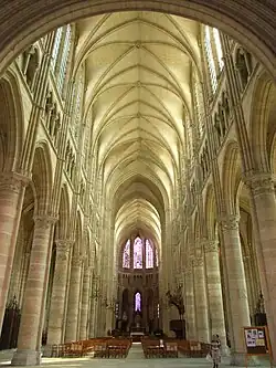 Das Langhaus gehört schon einer späteren Entwicklungsphase der Gotik an. Es wurde kurz nach 1190 gebaut und hat einen dreizonigen Wandaufriss wie zu Beginn der Gotik, aber in ganz anderen Maßverhältnissen. Das Arkadengeschoss ist sehr nach oben gezogen und die Fenster sind wesentlich vergrößert. Dazwischen liegt ein vierteiliges Triforium. Hier ist ein völliger Ausgleich erreicht worden zwischen den Arkaden und den Hochschifffenstern. Beide haben die gleichen Abmessungen. Nirgendwo in der gesamten Architekturgeschichte hatte es bisher Fenster von einer solchen Größe gegeben[2].