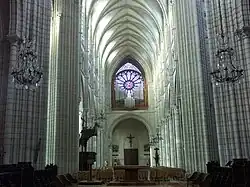 Der Innenraum ist wesentlich besser erhalten als die Fassade. Auch die Fensterrose der Westfassade verliert von innen ihren behelfsmäßigen Eindruck. Die moderne Orgel hat man in Soissons auf das Maßwerk abgestimmt. Das Glas innerhalb des Maßwerks ist neu.