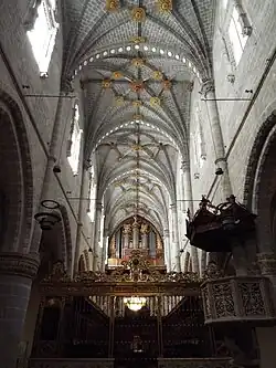 - Augenfälligster nachträglicher Einbau ist der exklusive Binnenchor (coro) für die Mitglieder des Domkapitels, der nach Westen durch eine Mauerschranke (trascoro) geschlossen ist, jedoch den Blick in Richtung Hauptaltar durch ein kunstvoll gestaltetes Gitter (reja) freigibt.