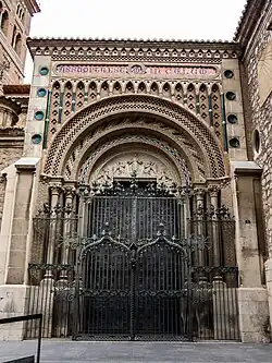 Markantester Bauteil ist der ca. 45 m hohe, unten quadratische, oben achteckige und mit einer Laterne abschließende Glockenturm, dessen Außenseiten beinahe zur Gänze mit Schmuckelementen (überschneidende Bögen, Zahnschnittdekor mit eingestellten Ziersäulen aus Keramik etc.) überzogen sind. Das im Neomudéjar-Stil erbaute Portal auf der Südseite der Kirche wurde im Jahr 1909 fertiggestellt.
