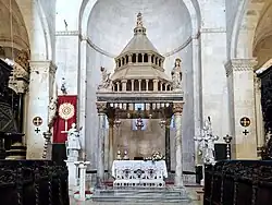 Meister Mavro hat im 14. Jahrhundert im Inneren der Kathedrale einen großen Altar in Form eines Baldachins gebaut. Auf dem Ziborium sind Skulpturen der Jungfrau Maria und des Erzengels Gabriel zu sehen (Verkündigung des Herrn) und seitlich vom Altar stehen Skulpturen des hl. Johannes von Trogir (sv. Ivan Trogirski) und des hl. Laurentius (sv. Lovre) aus dem 18. Jahrhundert. Die achteckige Kanzel mit romanischen Kapitellen ist ein Werk der einheimischen Kunstschule und wurde im 13. Jahrhundert fertiggestellt, die Chorbänke aus Holz hat Ivan Budislavic geschnitzt.[8]