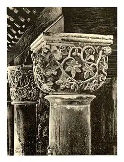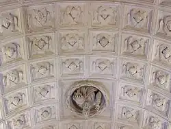 Dagegen ist das Gewölbe des Mittelschiffs gotisch, da es erst im 15. Jahrhundert gebaut wurde. Es wird vermutet, dass nach dem ursprünglichen Plan zwei Glockentürme vorgesehen waren und darum die Wände im Atrium extra massiv gebaut wurden.[12] Auf einem im ersten Stockwerk eingebauten Stein ist der eingemeißelte Grundriss eines Gebäudes zu sehen. Er zeigt einen dreischiffigen mit Pylonen geteilten Bau, auf einer Seite befinden sich die Pilaster, genauso wie in der Kathedrale selbst. Architekten vermuten, dass ursprünglich eine Kuppel über dem Mittelschiff vorgesehen war.