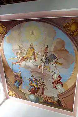 Lichtmetaphorik in einem Deckenfresko des Dillinger Jesuitenkollegs: Nicht das Licht der Aufklärung erhellt und entzündet die Welt, sondern der Lichtkranz des Christusmonogramms IHS