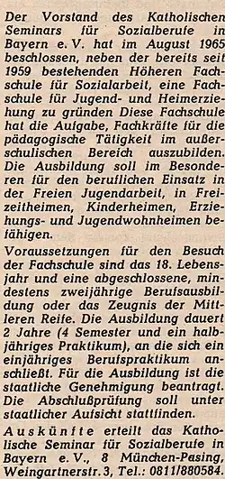 Am 8. August 1965 hatte der Vorstand des Schulvereins Katholisches Seminar für Sozialberufe in Bayern e. V. auf Initiative und unter Federführung von Hermann Zeit und Wilhelm Bleyer beschlossen, eine Fachschule für Jugend- und Heimerziehung (für Männer und Frauen) ins Leben zu rufen. Die nur wenige Jahre in München-Pasing angesiedelte Schule gehörte zu den ersten geschlechtsgemischten, konfessionell gebundenen sozialen Ausbildungsstätten in Bayern. Außerdem war sie deutschlandweit eine der ersten Ausbildungsstätten speziell für Jugend- und Heimerziehung. Bis dahin arbeiteten beispielsweise in den Heimen, wenn überhaupt ausgebildetes Personal, überwiegend Kindergärtner oder Hortner.