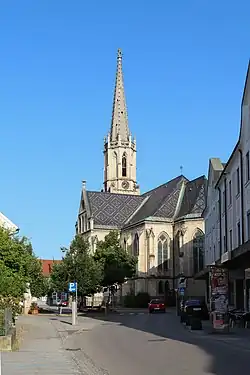 Die neugotische Hallenkirche wurde von 1869 bis 1888 nach Plänen des Dombaumeisters Otto Schirmer erbaut. Ihr Querschiff liegt in der Mitte des Langhauses. Der Chor ist eingezogen. Anstelle eines Kreuzes ziert die Turmspitze eine steinerne Krone.