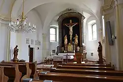 Der Hochaltar ist barock. Vor einer rundbogigen, dunklen Nische steht eine plastische Kreuzigungsgruppe aus der Zeit um 1733.