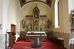 Es gibt einen neoromanischen Hochaltar, an dessen Seiten barocke Statuen aus dem 18. Jahrhundert stehen, die den hl. Nikolaus von Bari und den hl. Nikolaus von Tolentino (?) darstellen. Beim rechten Seitenaltar gibt es eine barocke Statuengruppe aus dem 18. Jahrhundert mit Pietà und den Heiligen Johannes und Magdalena unter einem Baldachin. Der linke Seitenaltar trägt ein Ölbild Madonna im Rosenkranz vom Maler F. Rath aus dem Jahre 1881.