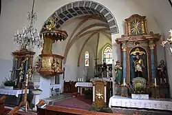 Der Hochaltar ist neugotisch. Die Seitenaltäre stammen aus der Mitte des 18. Jahrhunderts. Sie sind Säulenaltäre mit Aufsatz und gefassten Figuren. Auf der linken Seite befindet sich eine Madonna mit Kind zwischen der heiligen Barbara und der heiligen Katharina. Am rechten Altar ist eine Figur des heiligen Johannes Nepomuk. Dieser wird vom heiligen Joachim sowie vom heiligen Isidor flankiert.