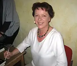 Kathrin Heinrichs bei der Signatur ihres Buches Bis auf den Grund