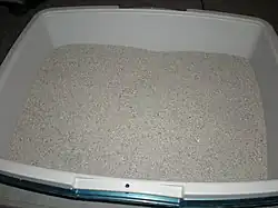 Darüber hinaus gibt es Streu-Produkte auf Basis von Kieselgel (auch als Silikagel bezeichnet). Die Kügelchen besitzen eine Vielzahl feiner Poren, so dass Flüssigkeiten gut aufgenommen werden können. Während die geruchsintensiven Stoffe des Katzenurins, insbes. Ammonium-Ionen, in der Streu gebunden bleiben, kann das enthaltene Wasser langsam wieder verdunsten, so dass die Katzentoilette über einen längeren Zeitraum trocken und geruchlich beanstandungsfrei bleiben kann.[3] Mit einer Schaufel entnommen werden müssen daher nur Kotabsetzungen, während Wasser nicht zu einer Klumpenbildung führt.