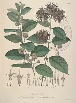 Es werden achsel- oder endständige, gestielte, kleine und vielblütige, dichte, köpfchenförmige Blütenstände gebildet die einzeln oder zusammengesetzt erscheinen. Die duftenden, kleinen, sitzenden, gelben und fünfzähligen, trichterförmigen Blüten sind zwittrig mit doppelter Blütenhülle. Der röhrige Kelch am kleinen, schmalen und röhrigen Blütenbecher besitzt nur minimale, spitze Zähnchen. Die Kronröhre ist bis 5–7 Millimeter lang und außen fein behaart mit kurzen, ausladenden, abgerundeten Lappen. Die 5 fast sitzenden Staubblätter sind am Schlund inseriert. Der zweikammerige Fruchtknoten ist unterständig mit langem, vorstehendem Griffel, die große Narbe ist keulenförmig. Es ist ein Diskus vorhanden.
