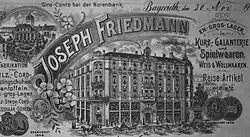 Das Kaufhaus Friedmann war eines der ersten Kaufhäuser in Bayreuth. Das in jüdischem Besitz befindliche Gebäude wurde auf Anordnung Adolf Hitlers im Jahr 1939 abgerissen.[1]