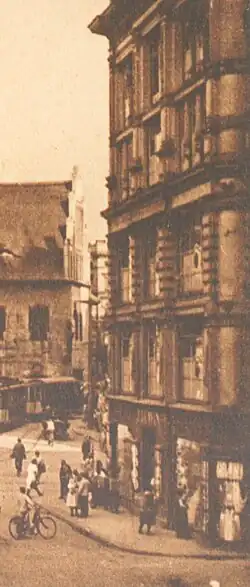 Im Jahr 1929 erhielt der Architekt Bruno Föhre den Auftrag für den Entwurf eines Kaufhaus-Neubaus und konzipierte einen kubischen Stahlbetonskelettbau. Für die künstlerische Gestaltung war Paul Juckoff verantwortlich, der an der Westseite des Gebäudes beispielsweise die Skulptur Das Symbol der Mode errichtete. Diese Plastik stellt eine stehende weibliche Person dar, die sich ein Tuch überwirft beziehungsweise bereits übergeworfen hat.[5]
