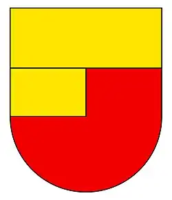 Der Wappenschild nach 1455 ist schräg gezackt in Gold und Rot. Die Helmzier mit einem geschlossenen Flug wiederholt das Motiv. Die Helmdecken tragen ebenfalls die Farben Rot und Gold.