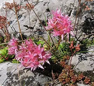 Die papillösen Blütentriebe sind niederliegend oder aufsteigend. Ihr Blütenstand bildet sehr dichte Ebensträusse mit drei bis fünf Zweigen und 15 bis 30 Blüten. Die verkehrt lanzettlichen bis länglichen Brakteen sind papillös. Die fünfzähligen (selten sechszähligen) Blüten sind fast sitzend oder kurz gestielt. Ihre deltoiden bis lanzettlichen Kelchblätter sind stumpf bis spitz und zu ihrer Spitze hin papillös. Sie sind bis zu 10 Millimeter lang. Die reinweißen bis blutroten Kronblätter sind im unteren Teil aufrecht, drüber meist ausgebreitet. Sie sind gekielt, fast eiförmig und besitzen ein kurzes, gelegentlich auch langes, aufgesetztes Spitzchen und sind 7 bis 15 Millimeter lang.[1] Die Staubfäden sind 5 bis 9 Millimeter lang und die Staubbeutel rot. Die Nektarschüppchen sind etwa 0,5 Millimeter lang und 1 Millimeter breit. Die Blütezeit reicht von Juni bis August.