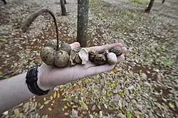 Die holzige, bei Reife bräunliche, gestielte Kapselfrucht, mit drei bis vier ellipsoiden Kapseln, ist etwa 4 bis 5 cm groß. Wenn sie reif sind explodieren die Kapseln ventral (bauchseitig) sehr gut hörbar mit einem lauten Knall und werfen ihre Samen über große Entfernungen aus.[6] Die harten, glänzenden, eiförmigen bis ellipsoiden und großen, wachsigen Samen sind bis etwa 2,3 × 1,5 cm groß, hellbraun bis gräulich mit dunkelbraunen Flecken, Streifen oder Sprenkeln.[3] Die Samen sind etwa 2–6 g schwer, die Tausendkornmasse beträgt ca. 3600–4250 g.[7] Die Samen sind giftig, sie enthalten Zyanid, das Tegmen ist papierig.[2]