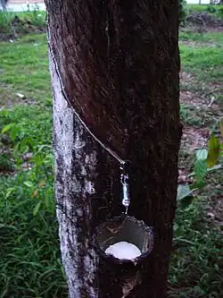 Nach etwa fünf bis sechs Jahren ist die Nutzpflanze alt genug für die Gewinnung des Milchsafts, beim Kautschukbaum auch als Naturkautschuk oder Latex bezeichnet. Die Milchröhren laufen entgegen dem Uhrzeigersinn in einem Winkel von 3,5° zur vertikalen Richtung. Daher erfolgt der Zapfschnitt spiralig mit einem speziellen Messer von links oben nach rechts unten in einem Winkel von 30° zur horizontalen Richtung. Beim Schnitt darf das unter den Milchröhren gelegene Kambium auf keinen Fall zerstört werden, da sonst keine Regeneration der Rinde und damit der Milchröhren möglich ist. Der Milchsaft tritt aus und wird in kleinen Eimern aufgefangen. Der Schnitt erfolgt nur über die Hälfte des Baumumfanges, damit ein Lebendstreifen die Wasser- und Nährstoffversorgung sichert.[1][10]