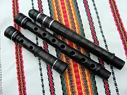 Die Flötentypen in Rumänien und der Republik Moldau heißen allgemein fluier; die meisten gehören zur Musik der Hirten und Bauern und werden von Amateurmusikern gespielt. Die Musikinstrumente der Schäfer werden nach ihrer Verwendung eingeteilt in Signalinstrumente, speziell die Holztrompete bucium (der ungarischen fakürt ähnlich), und Melodieinstrumente. Als caval wird hauptsächlich eine lange Kerbflöte bezeichnet, die entweder aus einer 50 bis 90 Zentimeter langen Röhre aus Platanenholz mit sechs Grifflöchern[26] oder mit fünf Grifflöchern, die in Gruppen zu zwei und drei angeordnet sind, besteht.