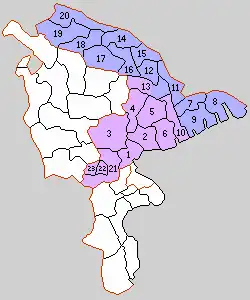 Karte der Gemeinden im ehemals zu Musashi gehörenden Teil von Kanagawa 1889 (am Tamagawa aber in den Grenzen von 1912, d. h. vollständig inklusive rechtem, ohne linkes Ufer), nummeriert die Gemeinden im Kreis Tachibana, davon auf dem Gebiet der heutigen Stadt Kawasaki: 7. Stadt (-machi) Kawasaki und die Dörfer (-mura) 8. Daishigawara (大師河原), 9. Tajima (田島), 11. Miyuki (御幸), 12. Sumiyoshi (住吉), 13. Hiyoshi (日吉), 14. Takatsu (高津), 15. Nakahara (中原), 16. Tachibana (), 17. Mukaoka (向丘), 18. Miyasaki (宮前, die Lesung wurde erst später zu Miyamae geändert), 19. Ikuta (生田) und 20. Inada (稲田); zusätzlich umfasst das heutige Stadtgebiet von Kawasaki noch die damaligen Dörfer Kakio (柿生) und Okagami (岡上; bis heute Exklave) aus dem Kreis Tsuzuki.[3]