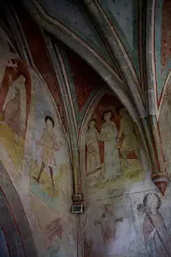 Dargestellt sind verschiedene Heilige und Kirchenväter sowie im Chorbogen die törichten und die klugen Jungfrauen. Neben dem mit Scheinarchitektur umrahmten Sakramentshaus ist das Letzte Abendmahl aufgemalt, zwischen den beiden Schlusssteinen Christus am Kreuz.[5]
