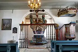 Das steinerne Taufbecken ist dem Stil nach romanisch, stammt aber möglicherweise erst aus der Erbauungszeit der Kirche. Ungewöhnlich sowohl für die Region als auch für die Zeit nach der Reformation ist die hölzerne Chorschranke von 1691, welche Kirchen- und Altarraum scharf voneinander trennt und von einer Kreuzigungsgruppe bekrönt wird. Die Christusfigur ist spätmittelalterlich (wohl kurz nach 1500); das Kruzifix und die beiden Seitenfiguren stammen von 1691. Der Querbalken ist auf der Vorderseite in Versalien mit dem Bibelvers Gal 6,14 auf Dänisch beschriftet, auf der Rückseite mit einer lateinischen Inschrift, welche den damaligen Pfarrer von Kegnæs, Simon Henrich Lilius (Lilie), als Stifter der Chorschranke nennt.[5]