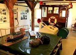 Die Besucher werden im Erdgeschoss über die Geschichte des Schiffbaus und der Küstenschifffahrt dieser Region informiert. Es beginnt mit kleinen Ewern und Besanewern, die zum Vortrieb mit Segeln ausgestattet waren. Schiffsmodelle zeigen diese Entwicklung und werden durch Werkstatteinrichtungen, Werkzeuge und Motoren ergänzt, die neben vielen anderen Exponaten ausgestellt sind. Außerdem werden im Erdgeschoss Geräte der Schiffsnavigation und der Funkkommunikation gezeigt, einige Objekte der Flussfischerei und Rettung auf See runden das Bild ab.