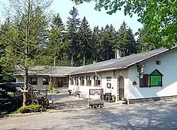 Um die Baukosten komplett aufzubringen, wurde am Fuß eine Schankwirtschaft eingerichtet und im Jahr 1900 konnte der Erzgebirgszweigverein ein einstöckiges Unterkunftshaus eröffnen. In der Folge mussten etliche Sanierungsarbeiten, auch Umbauten durchgeführt werden, die Bewirtschaftung wechselte häufig. Die Unterkunft wurde in späteren Jahren abgerissen und durch einen neuen Berggasthof ersetzt, der Platz für 60 Personen bot.[5] Er ist ebenfalls ein Flachbau, besitzt aber eine überdachte Terrasse und durch seinen L-förmigen Grundriss einen windgeschützten Hof. Der Gasthof diente auch als Veranstaltungsort für Feste, wie in einer Annonce 1909 zu lesen war: „Treffpunkt zum Sommervergnügen auf dem Keilberg mit Kinderbetreuung“. Das Gebäude wurde über mehrere Generationen privat betrieben. Als Besitzer werden genannt: Familie Barth (1900–1902), Carl Hunger (1902–1911), Emil Schellenberg (1912–1930), Oberförster Fritz Baumann (1930–1935), Curt Böhm (1935–1955). In lokalen Zeitungen warb zum Beispiel Emil Schellenberg 1913 neben einer Zeichnung des Hauses und des Aussichtsturmes mit folgender Anzeige für einen Besuch:
