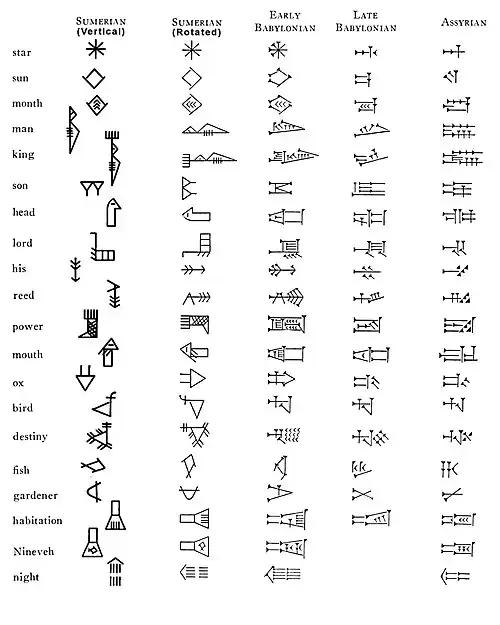 Die Entwicklungsgeschichte der Keilschrift lässt sich über Tontafeln nachvollziehen – mit Abschriften, die Tempelschüler bei ihren Lehrmeistern machten. Anfänglich handelte es sich bei den Schriftzeichen um Piktogramme, um vereinfachte bildhafte Darstellungen eines Gegenstandes oder Wesens. Beispielsweise stand der stilisierte Stern für „Stern“, „Gott“ und „Himmel“. Später entwickelte sich die Keilschrift zu Ideogrammen weiter, die komplexe Gedankengänge darstellten. Dann stand beispielsweise der stilisierte Stern auch für „oben“.