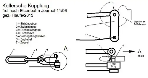 Sie besteht aus der Einhängeöse (Teil 1), der Zwischenöse (Teil 2) und der Drehbolzengabel (Teil 3). Die Einhängeöse wird beim Gebrauch der Kupplung in den Zughaken der Schiebelokomotive und die Drehbolzengabel in den Zughaken des Schlusswagens der schiebenden Einheit eingehängt. In der Drehbolzengabel sind der Drehbolzen (Teil 4), der die Kupplung am Schlusswagen im Zughaken hält, und der mit Federkraft gelagerte Verriegelungsbolzen (Teil 5), der den Drehbolzen am Ausschwenken hindert, gelagert. Der Verriegelungsbolzen ist mit einem mehrgängigen Gewinde versehen. Mit dem Verriegelungsbolzen verbunden ist der Zughebel (Teil 6), der den Verriegelungsbolzen bei Drehung gegen Federkraft vom Drehbolzen zurückzieht. Mit dem Zugseil (Teil 7) wird der Zughebel vom Führerstand der Schiebelokomotive aus bewegt.