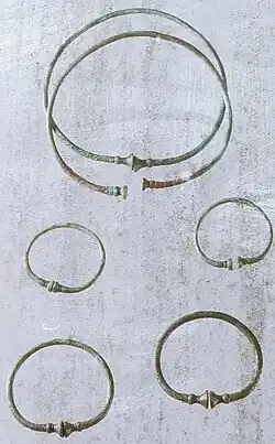 - ein massiver offener Bronzehalsring mit Petschaftenden und gerundetem Querschnitt (Dm.: 13,7 cm × 12,9 cm; St.: 0,45 cm)