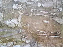 Bestattung 2 Der Erhaltungszustand dieses Skelettes ist wesentlich besser als der des Skelettes aus Bestattung 1. Erhalten sind große Teile des Schädels, der fast vollständige Kiefer, die fast vollständigen Langknochen der Arme und Beine mit Epiphysen und Apophysen, Rippen, Teile des linken Fußskeletts und des linken Handskeletts sowie Teile des Beckens. Daneben zwei Lenden- und einige Sakralwirbel.[3] Das östlich liegende Skelett trug am rechten Arm einen einzelnen Bronzering. Auf der linken Seite der Brust fanden sich Reste einer Bronzefibel und einer Eisenfibel. Rechts neben dem Schädel wurde eine einzelne eiserne Pfeilspitze aufgefunden. Die Funde sind im Einzelnen:[1]