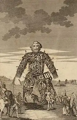 Er erwähnt auch an dieser Stelle den Brauch des Wicker man, bei dem ein aus Ruten geflochtenes riesiges Standbild (immani magnitudine simulacra) mit Menschen gefüllt und angezündet werde. Dieser fragwürdige Bericht geht möglicherweise auf eine Stelle bei Poseidonios zurück, die auch von Strabon (IV, 4,5) und Diodor (V, 32) zitiert wird.[42] In den Berner Lukan-Scholien werden für die Götter Teutates, Esus und Taranis verschiedene Opferriten beschrieben. Die Opferung durch Versenken in einem Moor war offenbar sowohl auf dem Festland als auch im inselkeltischen Bereich gebräuchlich. Als Beispiele dafür könnten der Lindow-Mann aus England und der Old-Croghan-Mann aus Irland stehen, die beide deutliche Tötungsspuren zeigen, wenn auch hier eine saubere Trennung zwischen Opferung oder Hinrichtung schwerfällt.[43][44] Auf die Opferung des Königs wird beim Sakralkönigtum eingegangen.
