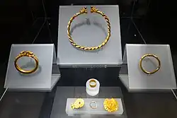 | Armring | Gold | Durchmesser 67,7 mm außen, innen 54,7 mm. Gewicht 29,6 g. Steckverschluss. Mit Ornamenten verziert. Vermutlich aus der gleichen Werkstatt wie der Torques. | 1 | Keller Nr. 3 |
