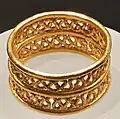 | Armreif | Gold | Glatter, hohler ovaler Armreif. Details der Oberfläche ziseliert, gepunzt und graviert. Im Gießverfahren hergestellt. Aus mehreren Teilen zusammengesetzt.[A 2][18] Durchmesser außen 80,5 mm, innen 61 mm. Gewicht 117,1 g. An beiden Enden eine figürliche Darstellung mit Kopf und Brustbereich. Auf dem Kopf vogelartiger Schmuck und Helm in Gestalt eines Raubvogels. An den Schultern Flügel. Die vor der Brust gehaltenen Hände halten einen nicht identifizierbarer Gegenstand. Darstellung der Haare sowie eines Kleides. Über den Köpfen mit Blickrichtung nach außen die Darstellung zweier Raubkatzen, deren Schnurrhaare als gepunzte Punkte zu erkennen sind. Die figürliche Darstellung vereint Attribute der Göttinnen Artemis und Minerva. | 1 | Keller Nr. 2 |